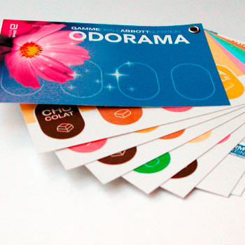 Agoria réalise à partir d’arômes artificiels existants ou crée sur-mesure des nuanciers olfactifs pour la cosmétique ou l’industrie alimentaire. Plusieurs principes sont aujourd’hui proposés, comme les encres olfactives à gratter ou les papiers encapsulés.
